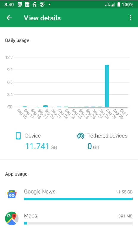 今年9月,有用户反映他手机的Google News在后台运行,一夜之间就用了7.65GB流量,另一名用户在Twitter上贴出统计图,显示他的手机在9月29日晚上使用了高达11.55GB的移动流量,而在Google论坛上有用户反映甚至几个小时就被Google News吃了24GB的流量。